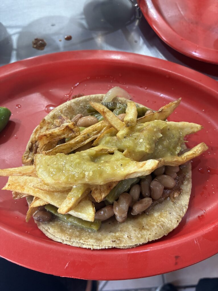 左のタコスはフライドポテト、フリホレス(豆)、焼きサボテンと一緒に出てきました。