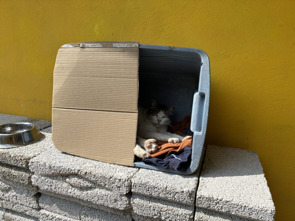 飼っている猫(カトニス)だけは、犬と喧嘩してしまうので、外で飼われている。