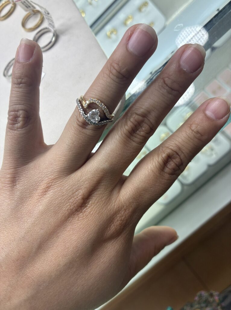 お店の人が提案してくれた「婚約指輪を結婚指輪を両方つける」というアイデアに