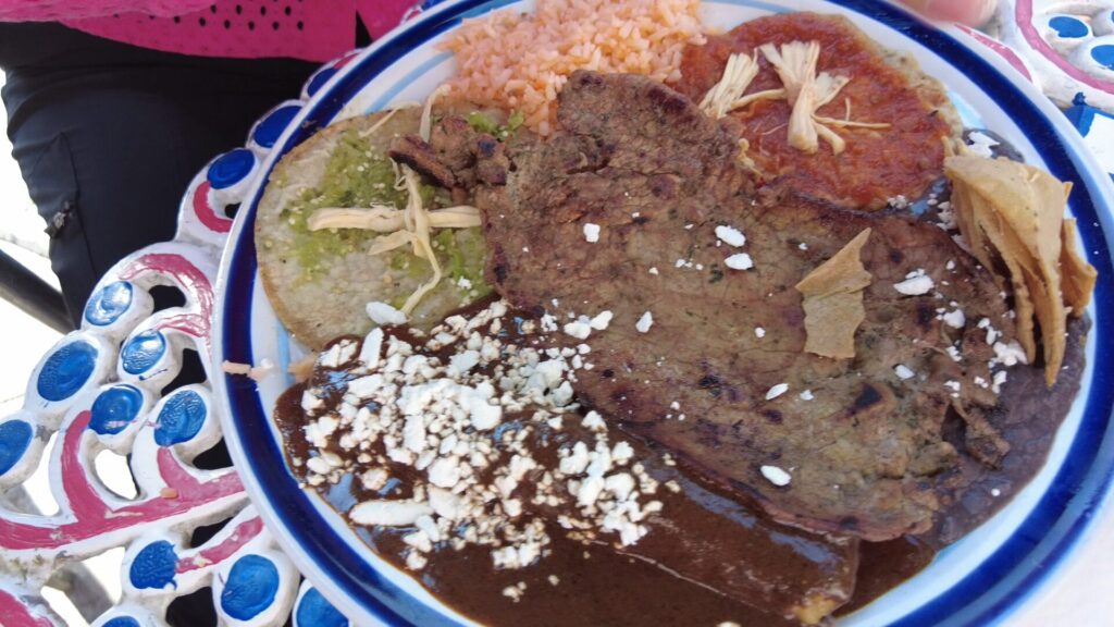 写真の下の方にあるのがモレソース。赤と緑のソースがかかったトルティーヤみたいなものはチョルーパという料理。